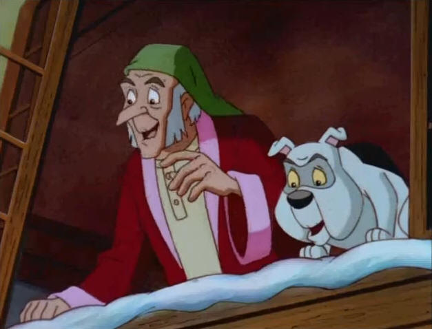 So far we've looked at two animated versions of this scene and both of them have featured fun animal sidekicks for Scrooge (the previous scene had some mice that Scrooge has an existential crisis at between asking the urchin the date and asking him to buy the turkey). I wonder what possessed these film makers to make such a bold addition to Charles Dickens' original story, and whether or not Dickens would have approved. Is the addition of a dog to the urchin scene something the original creator would have made to update the story for the 21st Century, like how George Lucas considers his most recent Original Trilogy edits to be the 'completed' versions? These are the questions that haunt me every day.
