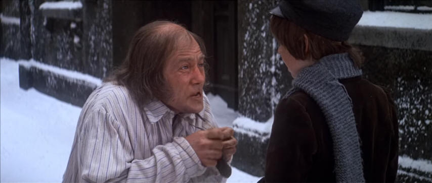 We're moving back into live action for our next Scrooge-urchin shot-reverse-shot dialogue analysis. We're once again dealing with a classic adaptation, the musical version with Albert Finney and Alec Guinness, so it's important for me to cut through the nostalgia and acclaim to get to the beating heart of what really matters: how well the urchin conversation at the end is handled. I'm here to take the controversy of criticising a beloved Christmas film so other media scholars don't have to.