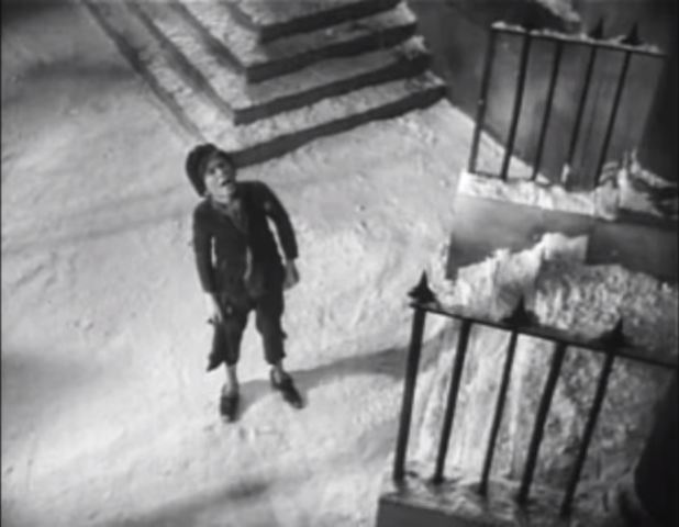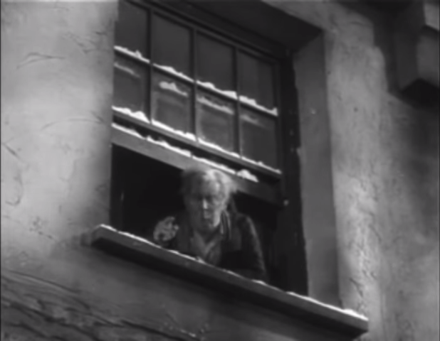 We can see in the urchin shot that the idea of shooting them from high up to simulate the height of the window was not a new idea by the time Donner used it, nor is it a particularly bad one. It is worth noting however that we can tell from where the urchin is looking that despite looking down on him we aren't actually in Scrooge's perspective. Instead, it is as if we are looking down on the urchin from a window next to Scrooge's, almost like we too have been transported to the Victorian past as mere observers rather than active agents, much like Scrooge was in his travels through his own history.