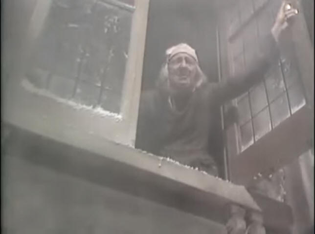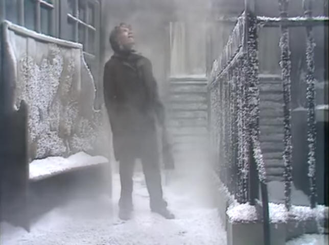 We're jumping now to a more recent version of the scene from the late 70s. The main thing to note about this one is that it was made by the BBC, which of course means the set is a lot smaller and cheaper looking and Mark Gatiss is probably in it somewhere if you look hard enough. The angle at which we're looking up at Scrooge is much more narrow, which turns him into a much more imposing and threatening figure. Michael Hordern gives a nice warm performance though, and the date revelation is played very well.